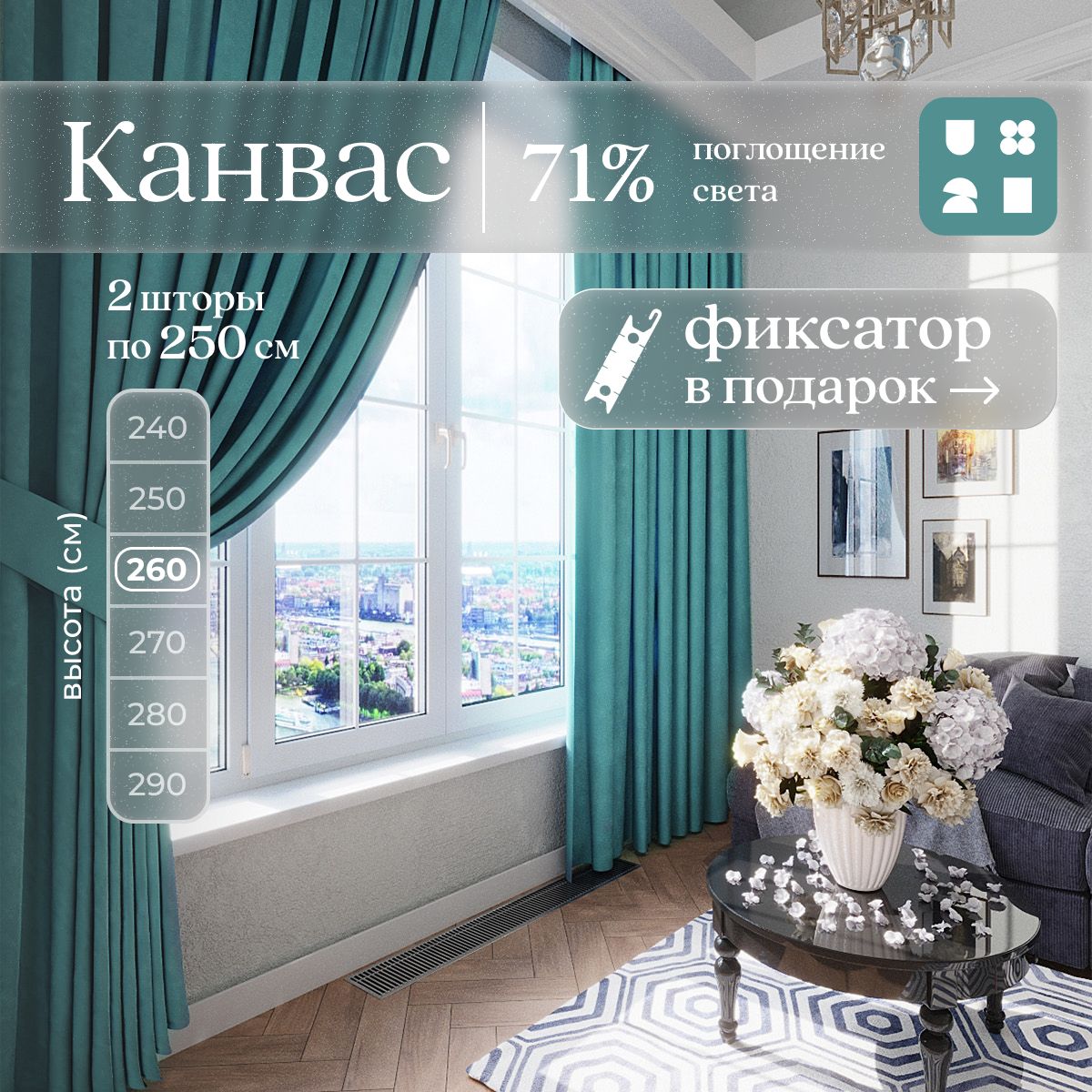 Комплект 2 шторы по 250 х 260 см для гостиной и спальни из плотного турецкого канваса, размер L: 500 х 260 см, бирюзовый, лазурный, морская волна