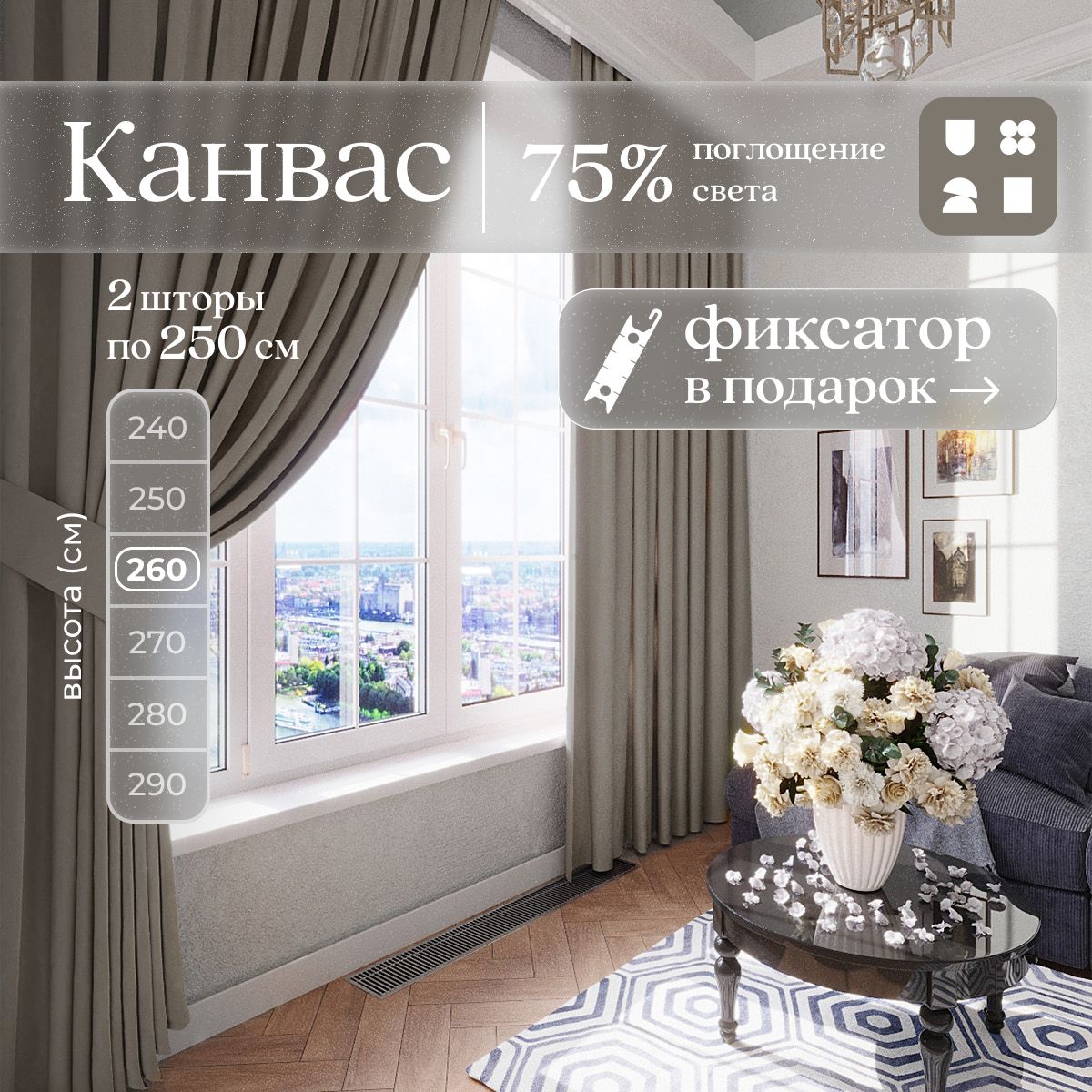 Комплект 2 шторы по 250 х 260 см для гостиной и спальни из плотного турецкого канваса, размер L: 500 х 260 см, светло-коричневый, глубокий тауп