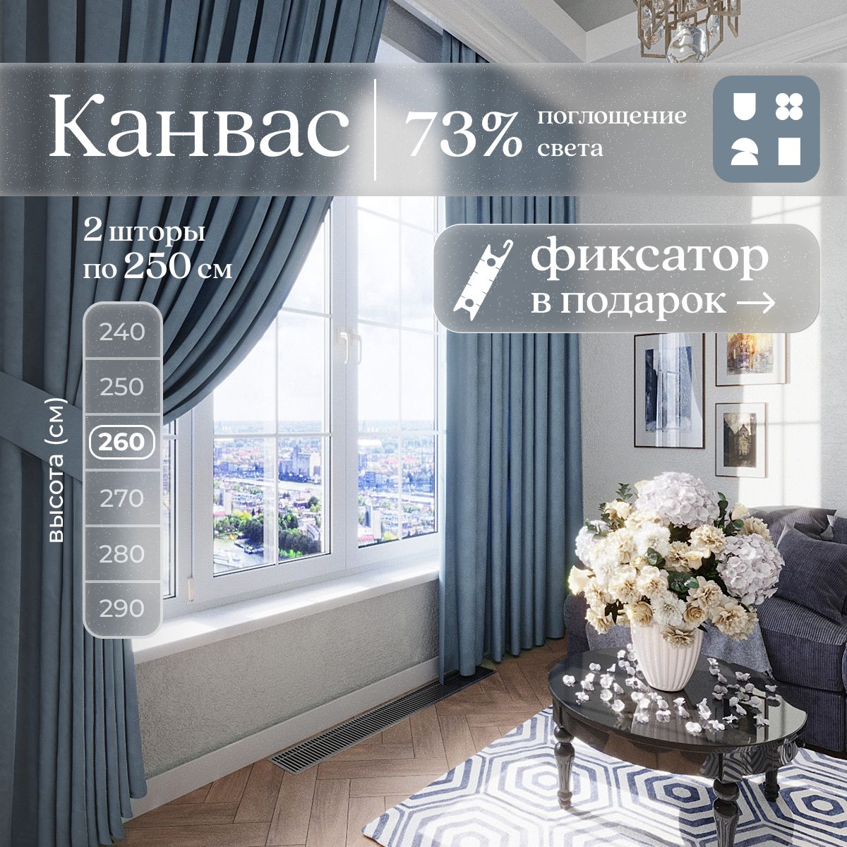 Комплект 2 шторы по 250 х 260 см для гостиной и спальни из плотного турецкого канваса, размер L: 500 х 260 см,серо-голубой, синий