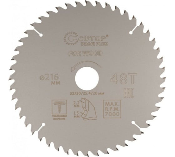 Диск пильный с тефлоновым покрытием по дереву Profi plus 216x1.5/2.2x32/30/25.4/20 мм, 48Т CUTOP 75-21648Т 23112189